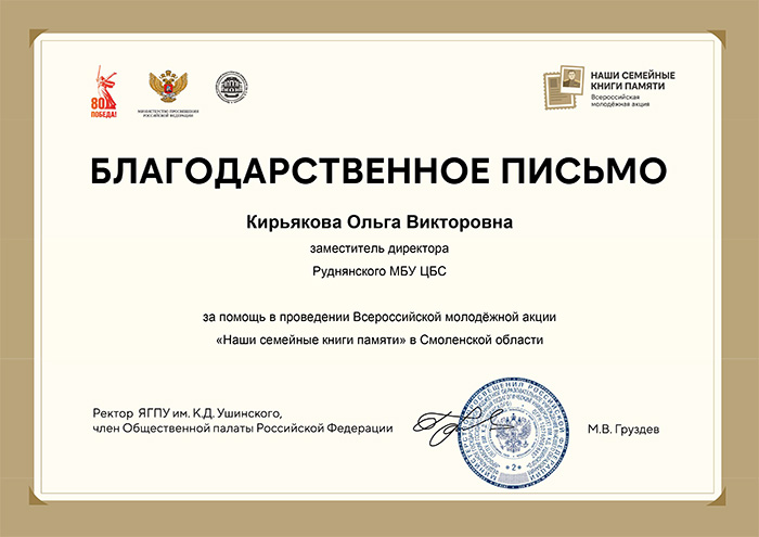 Благодарственным письмом Ярославского государственного педагогического университета им. К. Д. Ушинского награждена Кирьякова Ольга Викторовна, заместитель директора Руднянского МБУ ЦБС, за помощь в проведении Всероссийской молодежной акции «Наши семейные книги памяти». |