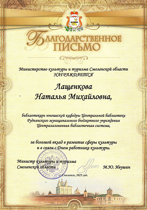 Благодарственным письмом Министерства культуры и туризма Смоленской области награждена Лащенкова Наталья Михайловна, библиотекарь юношеской кафедры Руднянской центральной библиотеки, за большой вклад в развитие сферы культуры и в связи с Днём работника культуры.