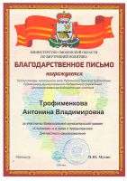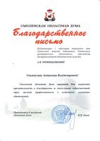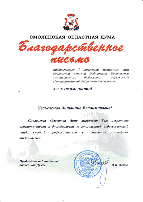 Благодарственным письмом Смоленской областной Думы награждена Трофименкова Антонина Владимировна, библиотекарь 1 категории читального зала Руднянской детской библиотеки, за многолетний добросовестный труд, высокий профессионализм в исполннении служебных обязанностей.