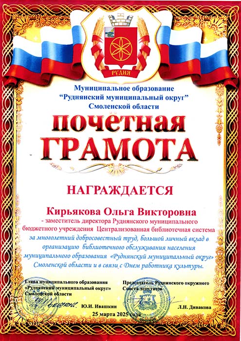 Почётной грамотой муниципального образования«Руднянский муниципальный округ» Смоленской области награждена Кирьякова Ольга Викторовна, заместитель директора Руднянского МБУ ЦБС, за многолетний добросовестный труд, большой личный вклад в организацию библиотечного обслуживания населения МО «Руднянского мунгиципального округа» Смоленской области и в связи с Днём работника культуры. |