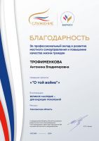 Трофименкова Антонина Владимировна, библиотекарь читального зала Руднянской детской библиотеки награждена Благодарственным письмом Министерства Смоленской области по внутренней политике и Благодарностью Всероссийской ассоциации развития местного самоуправления за участие во Всероссийской премии «Служение» в номинанции «Великое наследие – для будущих поколений» (проект «О той войне»).