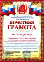 Благодарственным письмом Муниципального образования Руднянский район Смоленской области награждена Кирьякова Ольга Викторовна, заместитель директора Руднянского МБУ ЦБС за многолетний добросовестный труд, большой личный вклад в организацию библиотечного обслуживания населения Руднянского района и в связи с Днём работника культуры. |