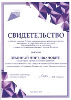Свидетельство о победе в конкурсе «Лучшие муниципальные учреждения культуры, находящиеся на территории сельских поселений Смоленской области, и их работники» в рамках реализации национального проекта «Кульутра» выдано Деминой Нине Ивановне, заведующей Любавичской библиотекой-филиалом № 14 Руднянского МБУ ЦБС. |