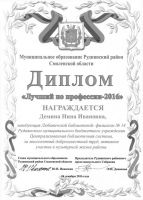 По итогам работы за 2016 г. Дёмина Нина Ивановна, заведующий Любавичской библиотекой-филиалом №14 награждена Дипломом Муниципального образования Руднянский район Смоленской области «Лучший по профессии – 2016», памятной лентой, денежной премией. |