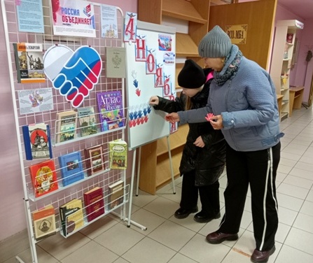 акция-квилт «Россия объединяет». Участники акции ознакомились с выставкой об истории праздника и интересных фактах о нашей стране.