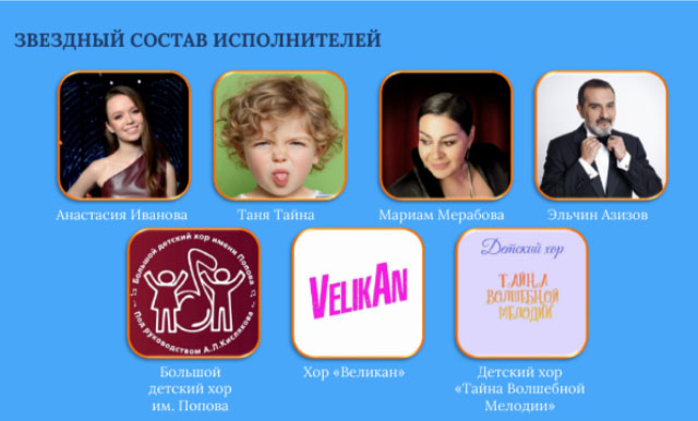 В создании проекта приняли участие ведущие артисты и детские хоровые коллективы: финалистка «А-ну ка, все вместе» Анастасия Иванова, Большой детский хор имени В. С. Попова, хор «Великан».