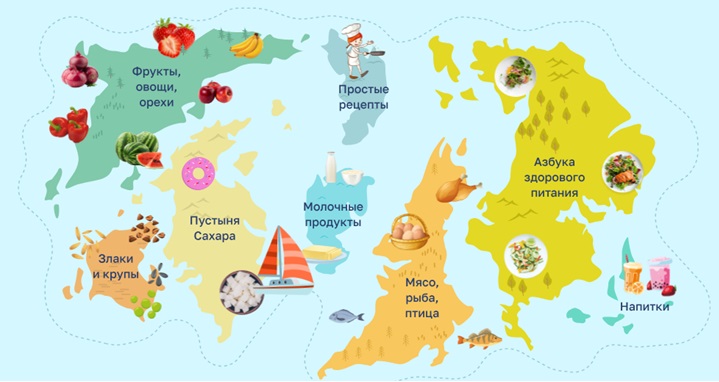 «Острова здорового питания». Каждый остров имеет свое название: «Фрукты, овощи, орехи», «Простые рецепты», «Азбука здорового питания», «Злаки и крупы», «Пустыня сахара», «Молочные продукты», «Мясо рыба птица», «Напитки». Путешествуя по интерактивным островам вы найдете много полезной информации о продуктах, полезных рецептах. Приглашаем вас в путешествие на острова: