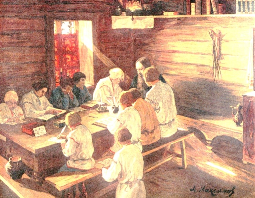 В старину грамоте учили по церковным книгам. Дети сидели все вместе, но занимался учитель с каждым отдельно. Определённого срока обучения тоже не было. Научился читать, писать, считать – обучение заканчивалось. Всё зависело от способностей ученика.