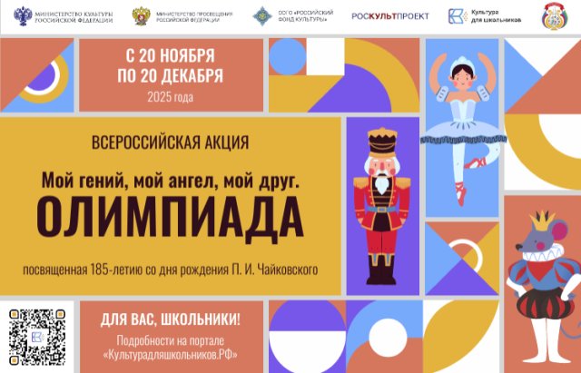 С 20 ноября по 20 декабря 2025 года в рамках межведомственного культурно-образовательного проекта «Культура для школьников» пройдет всероссийская акция «Мой гений, мой ангел, мой друг. Олимпиада», посвященная 185-летию со дня рождения величайшего русского композитора П.И. Чайковского.