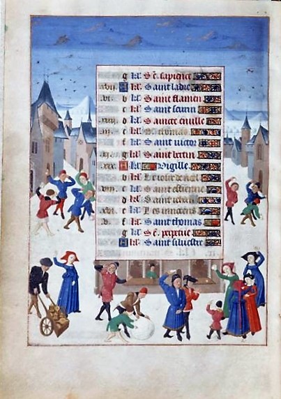 * Первое изображение снеговика появилось в период Средневековья, на страницах «Часослова» (богослужебной книги) 1380 года. Иллюстрация была изображена рядом с описанием распятия Христа. При этом образ человека, вылепленного из снега и тающего у костра, был весьма устрашающим.